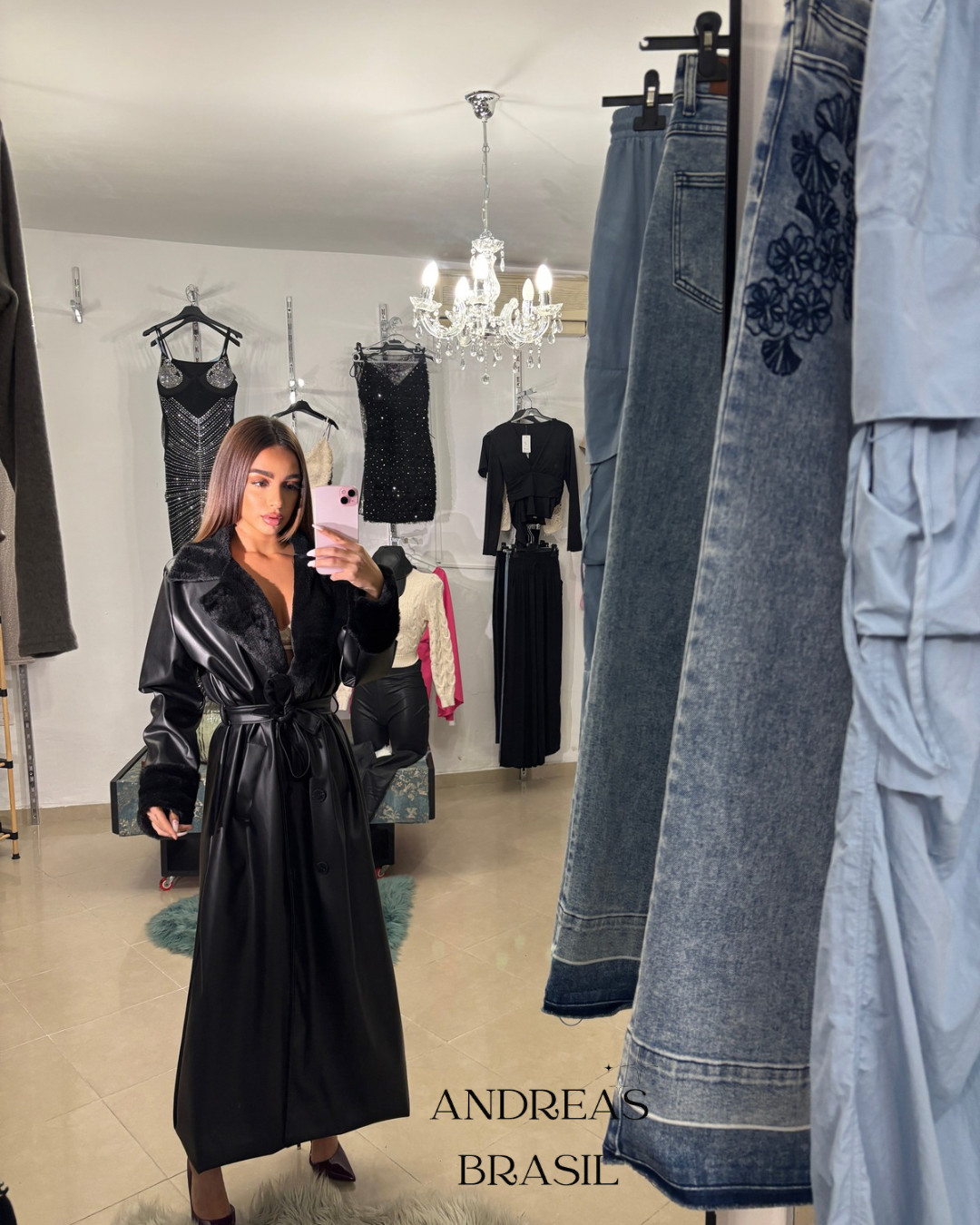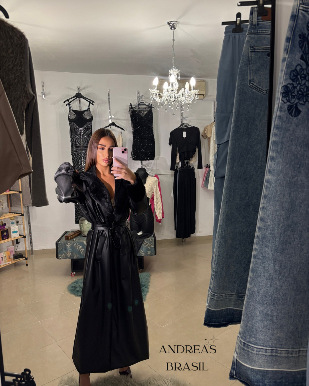 Chaqueta larga de efecto piel con acabado suave y elegante, diseñada para elevar cualquier look. Incorpora cinturón ajustable que estiliza la silueta y detalles en cuello y puños con acabado tipo pelo, aportando un toque sofisticado y femenino.