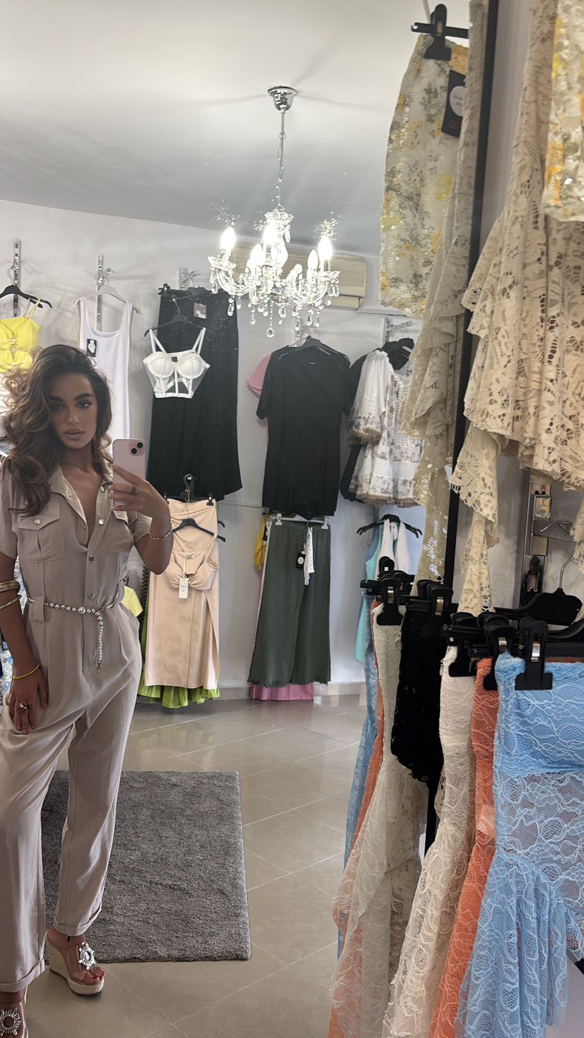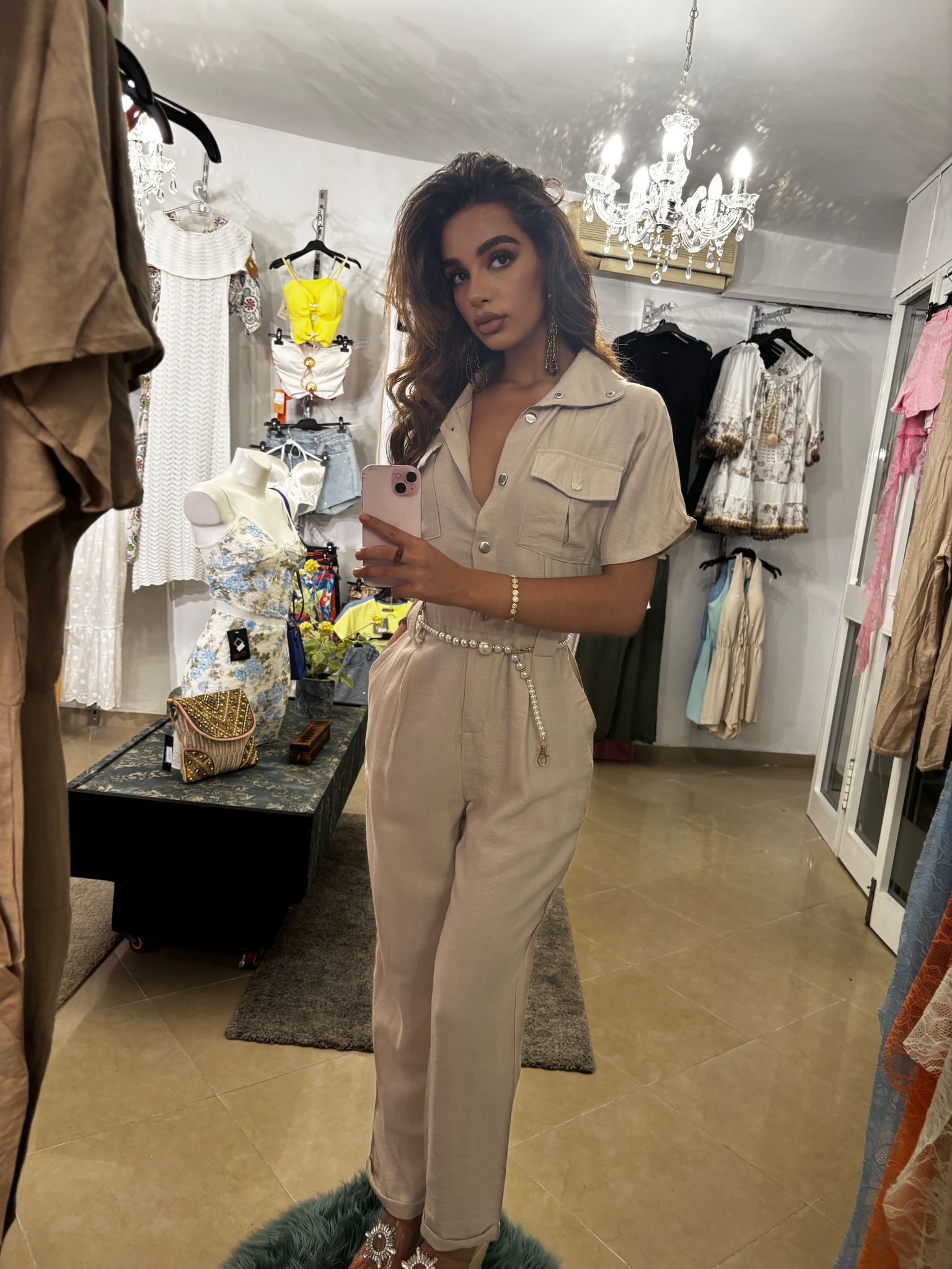 Mono largo de inspiración minimalista, confeccionado en tejido tipo lino, ideal para los días de calor con un aire refinado. Su silueta favorecedora se complementa con botones cromados que aportan un detalle de brillo sutil y elegante.