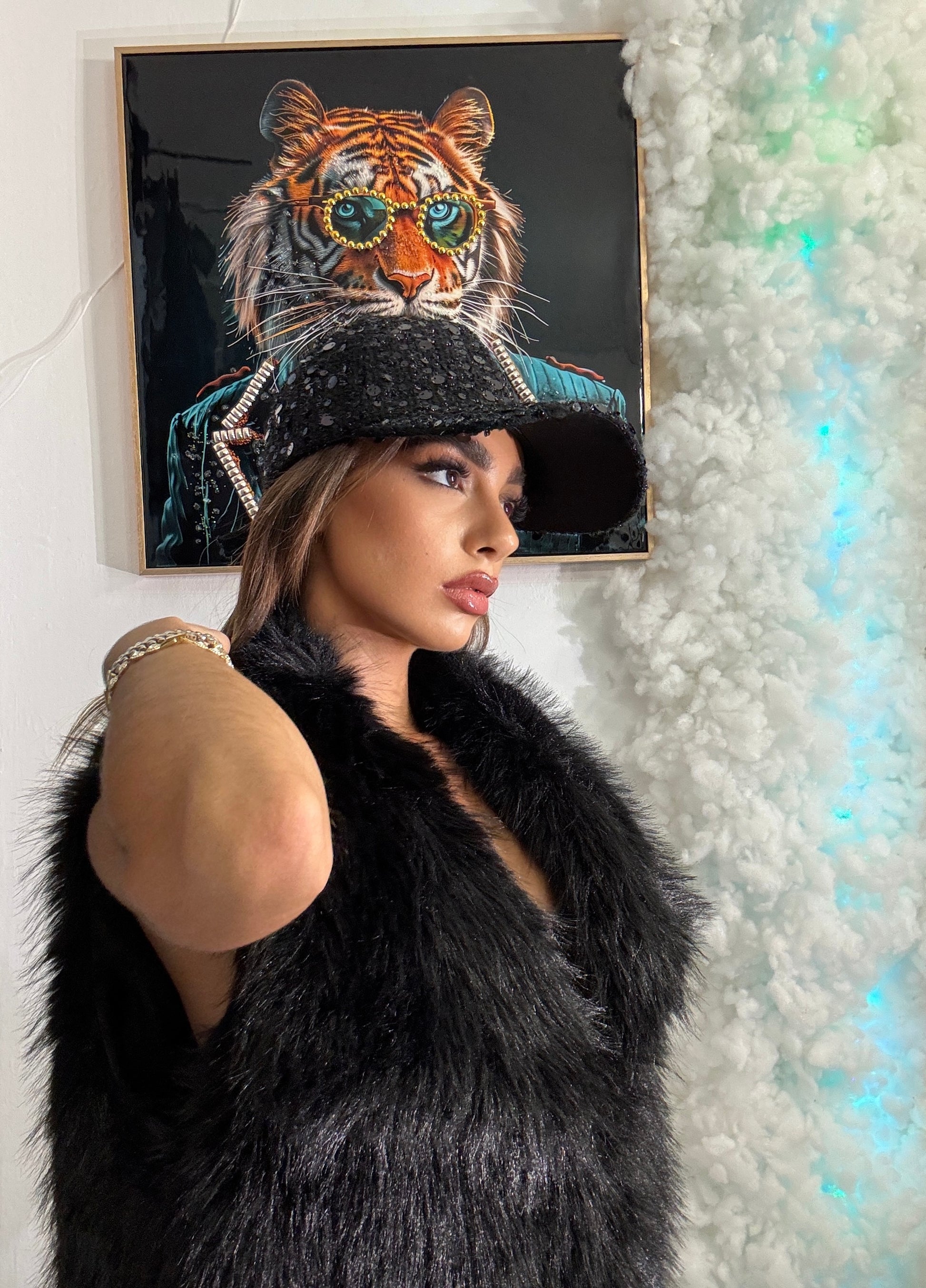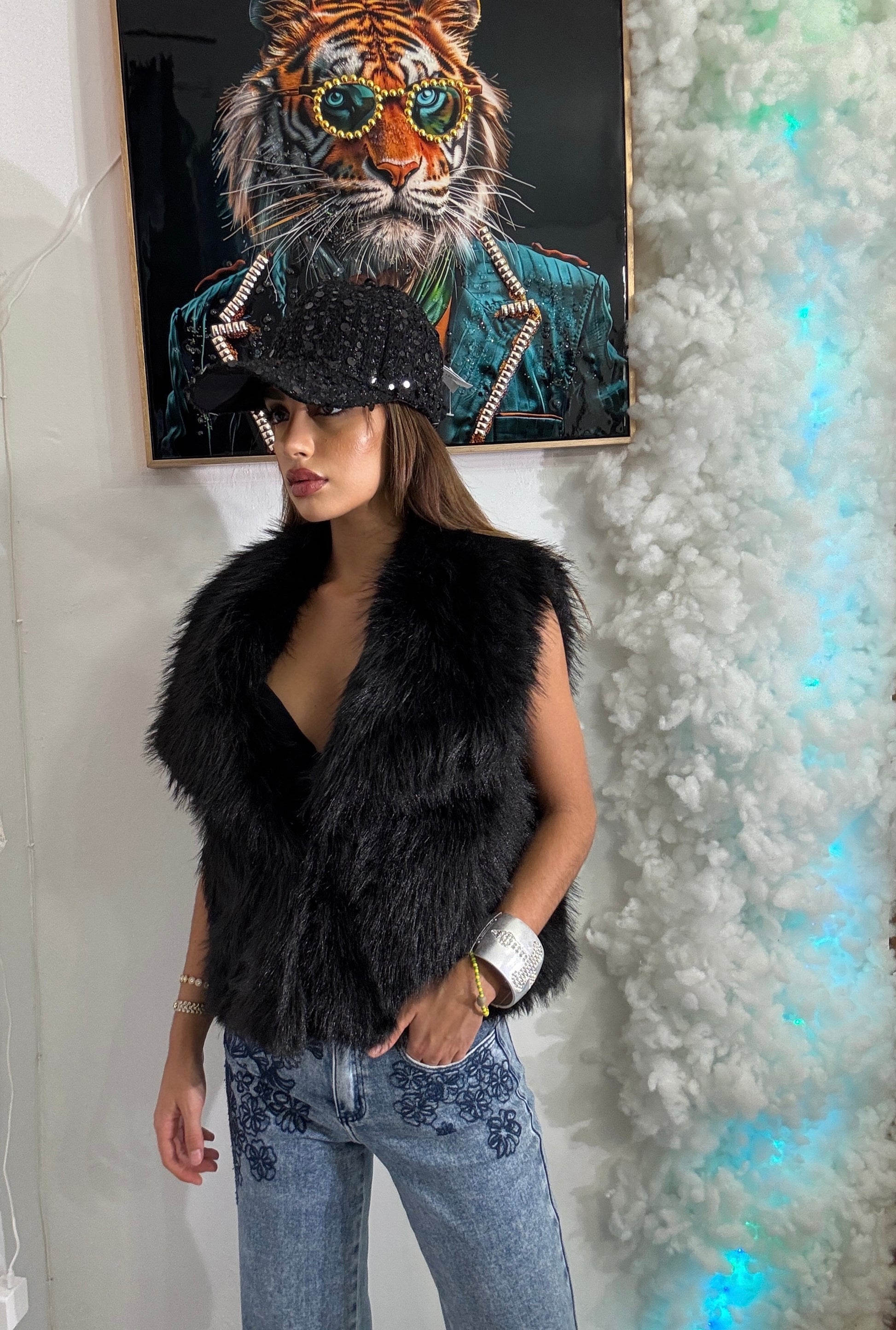Chaleco sin mangas de pelo suave con broches frontales. Disponible en negro y beige, perfecto para un look elegante y cálido en temporada de frío.