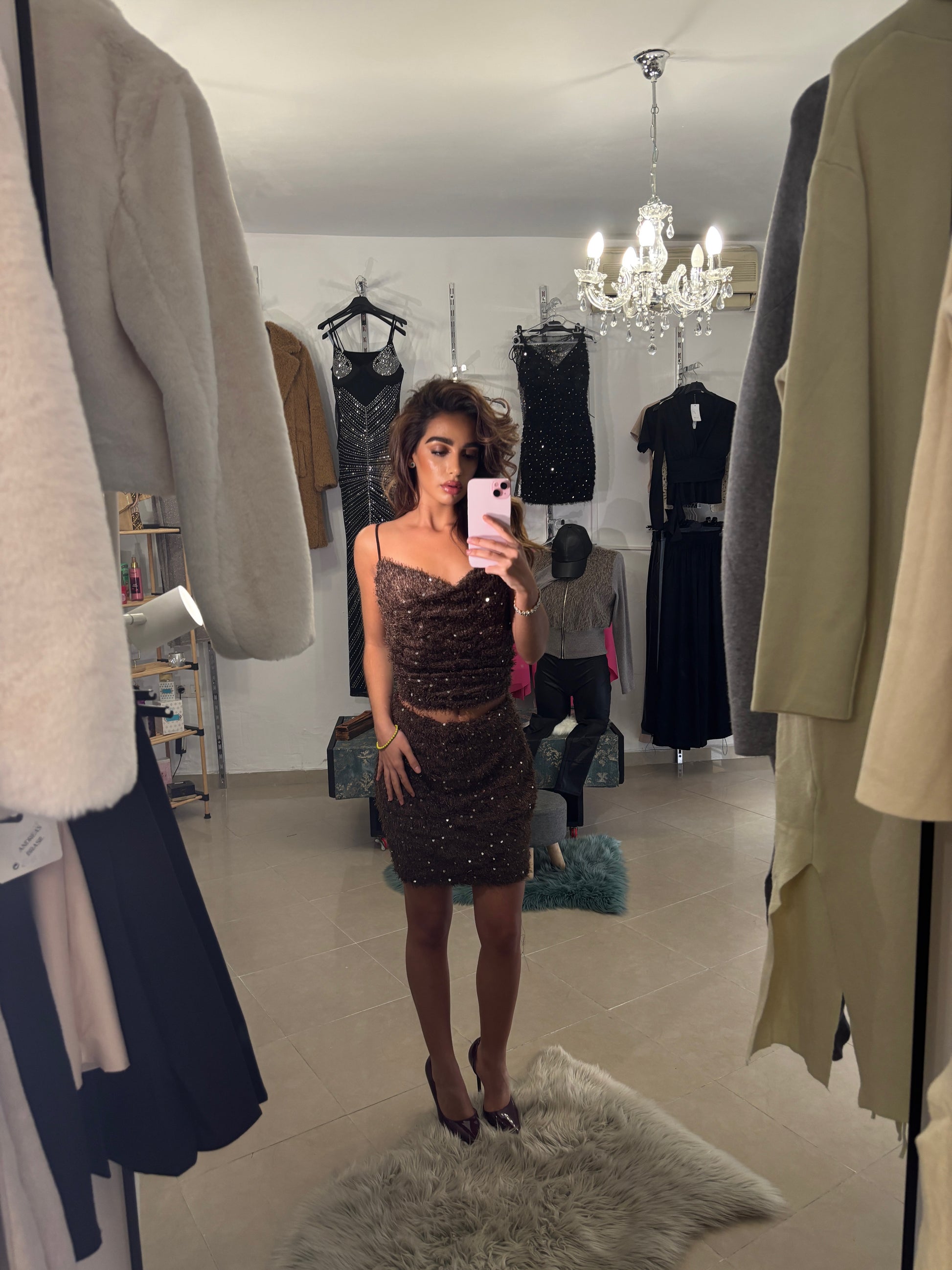 Falda de lentejuelas color chocolate. Su textura brillante y su corte favorecedor realzan la silueta con un toque cálido y sofisticado.