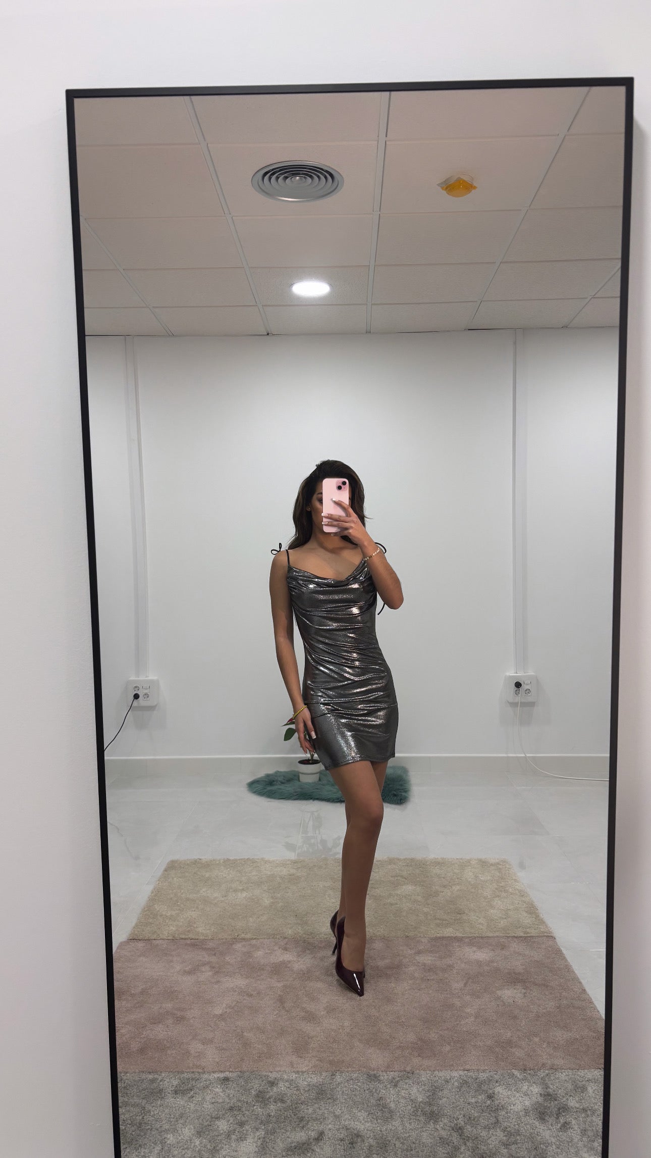 Vestido en tono plateado con tirantes finos y acabado brillante. El frunce en la parte trasera realza la silueta, mientras que el tejido elástico ofrece comodidad y un ajuste perfecto. Elegante y versátil, ideal para ocasiones especiales.