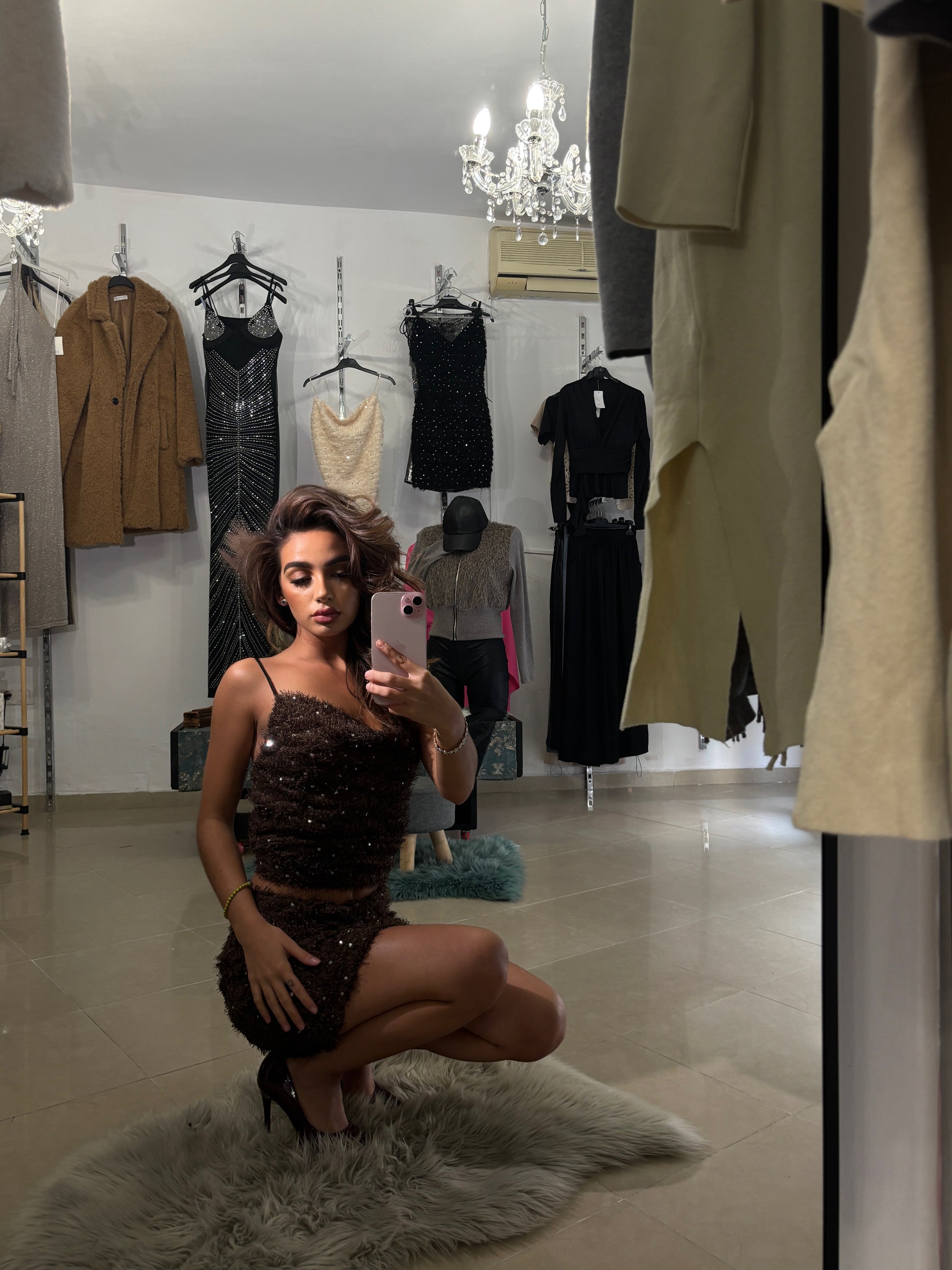 Top de lentejuelas color chocolate. Su textura brillante y su corte favorecedor realzan la silueta con un toque cálido y sofisticado.