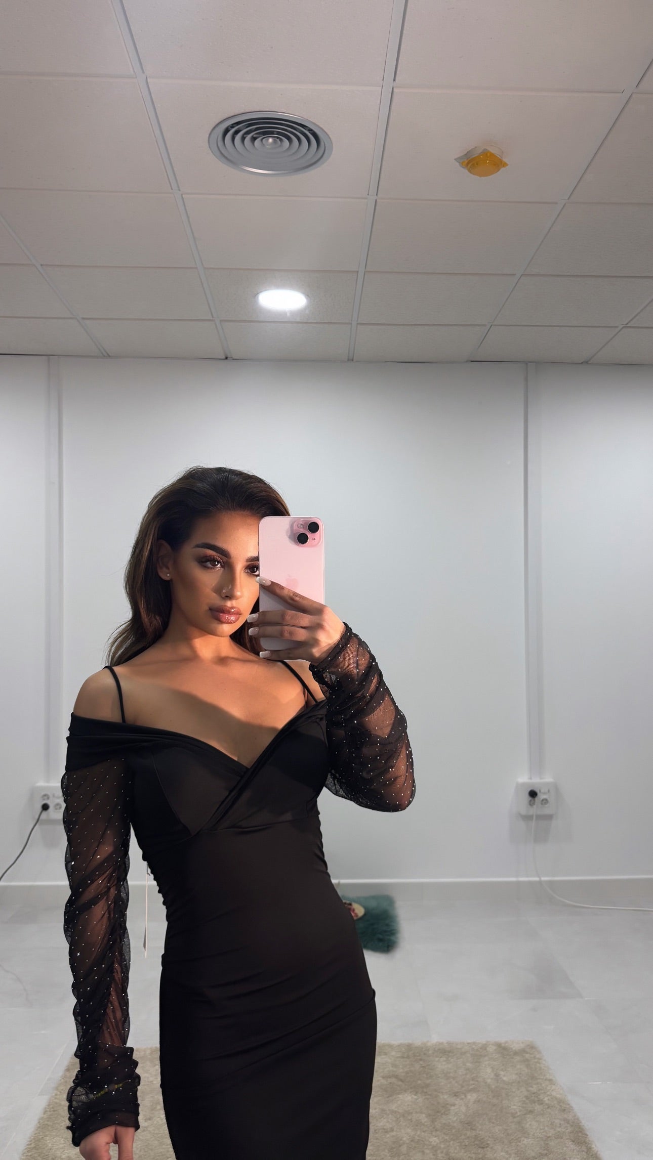 Vestido negro midi con tirantes finos y mangas fruncidas adornadas con cristales bordados. El fruncido lateral estiliza la silueta, mientras que los cascos integrados ofrecen sujeción y comodidad. Una prenda sofisticada y brillante.