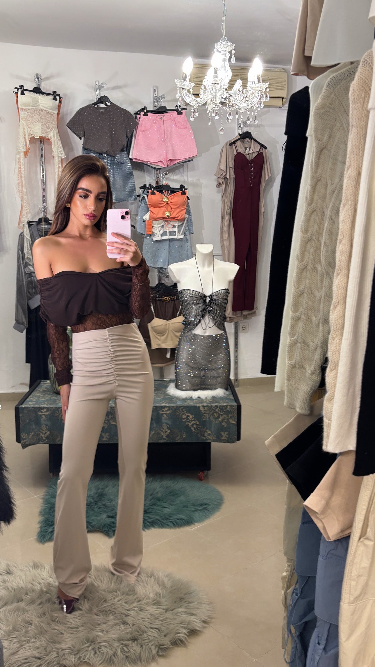 Pantalón en tono Beig de corte recto con fruncido delantero y trasero que estiliza la figura. Cintura alta y tejido adaptable con caída elegante. Una prenda versátil para looks de día o de noche. Talla única (equivale de XS a L)."