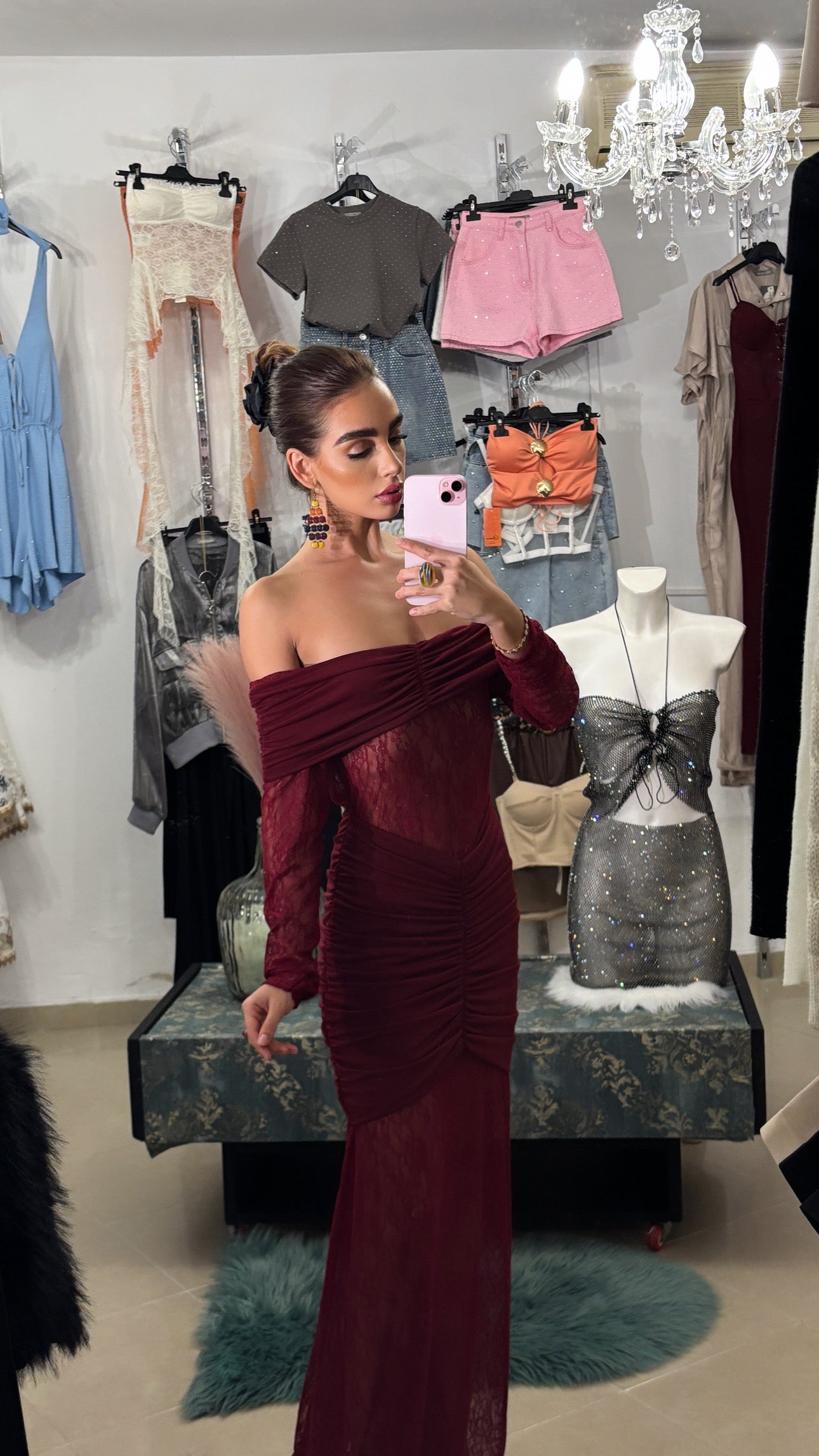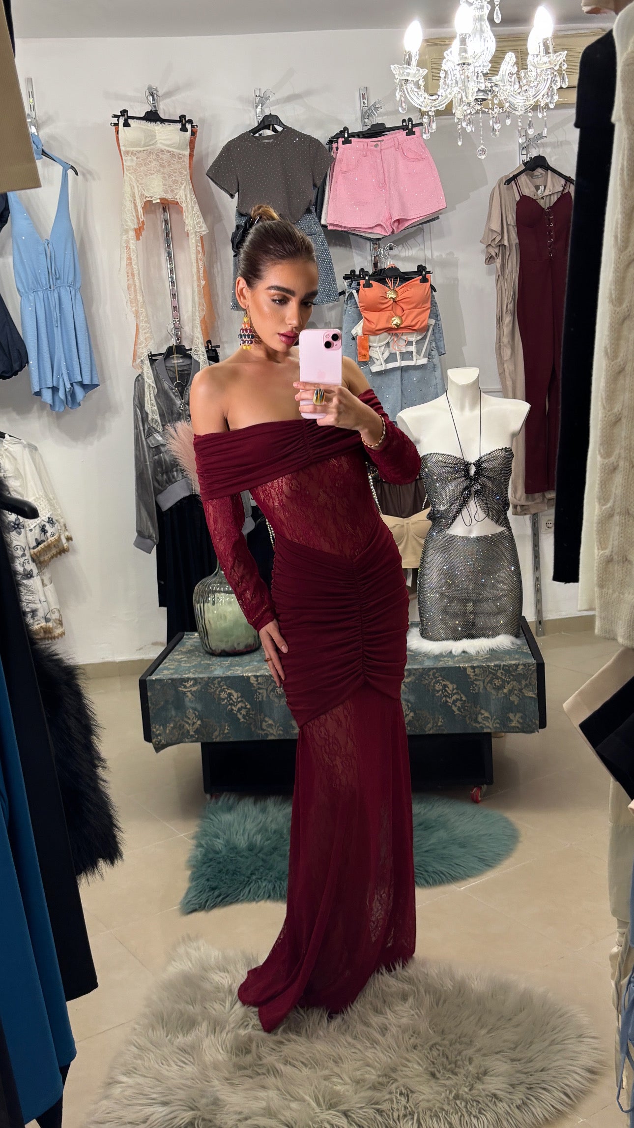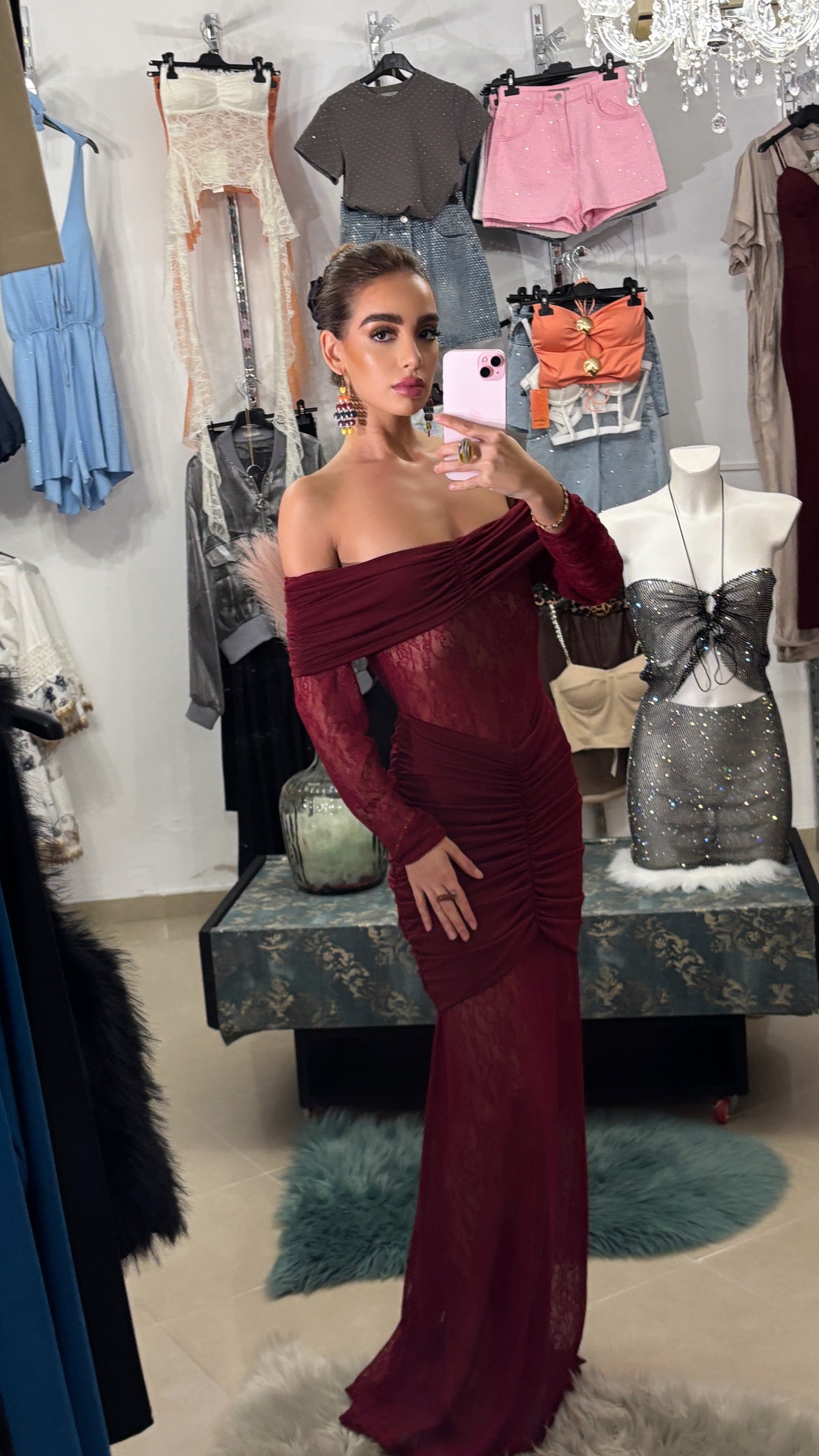 - Vestido en color vino con fruncido lateral y escote palabra de honor. Ajustado, favorecedor y con la calidez de los tonos italianos.