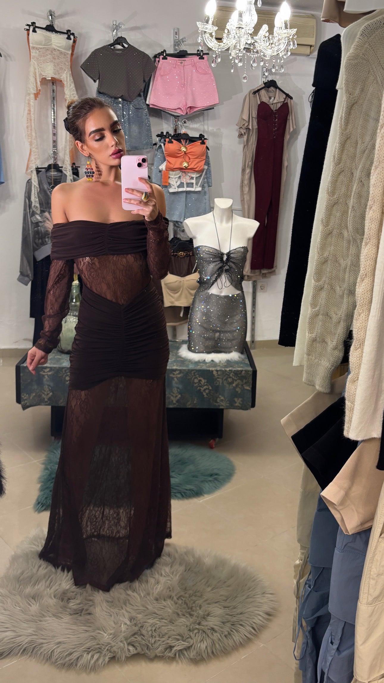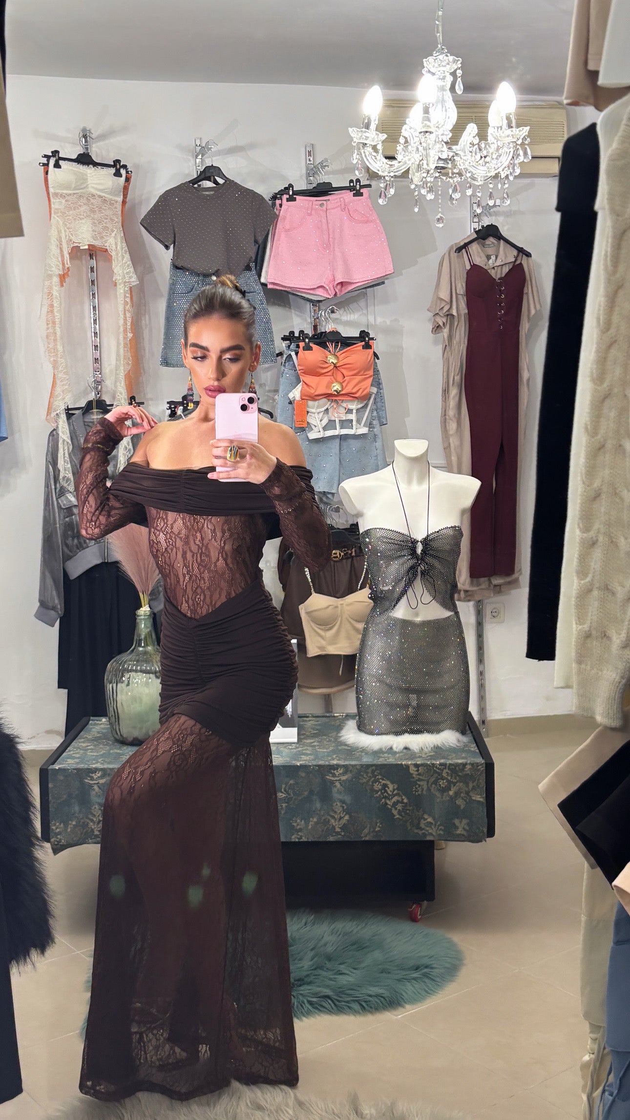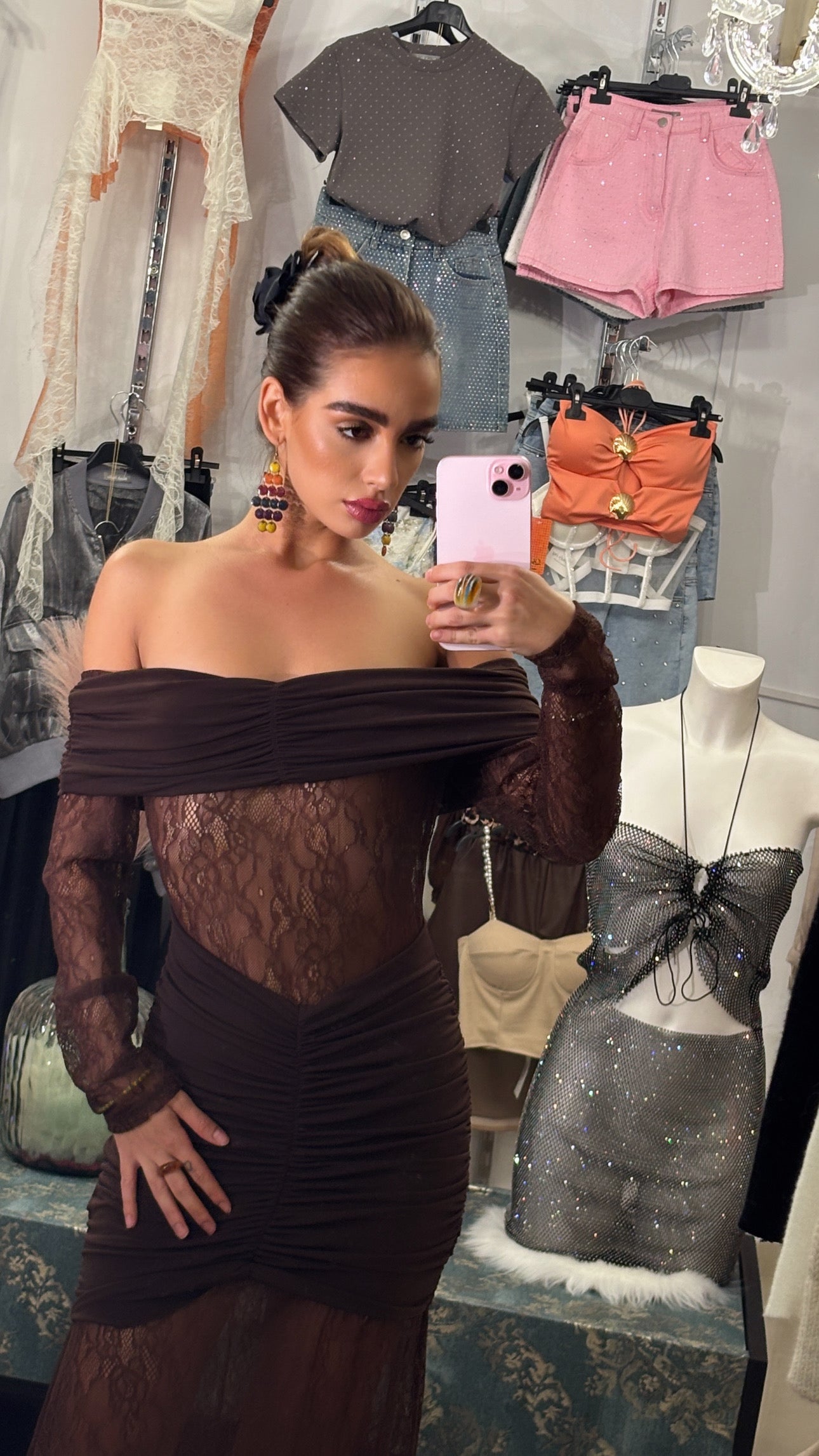 - Vestido marrón con fruncido lateral y escote palabra de honor. Ajustado, favorecedor y con la calidez de los tonos italianos.